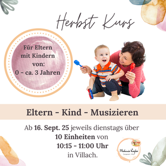 Damit der Familienalltag auf ganz einfache Weise mit Musik bereichert wird, erobern wir mit einfachen Instrumenten und bunten Tüchern gemeinsam mit den Babys und Kleinkindern die Welt der Musik. Die Kleinen können die Nähe zur Bezugsperson genießen, während wir für ein Schaukellied in ein altes Schiff einsteigen, altbekannte Kinderlieder und Reime wieder entdecken oder bei einer mitreißenden Kniereiter-Fahrt im Schotterwagen so richtig flotten Rhythmus spüren.